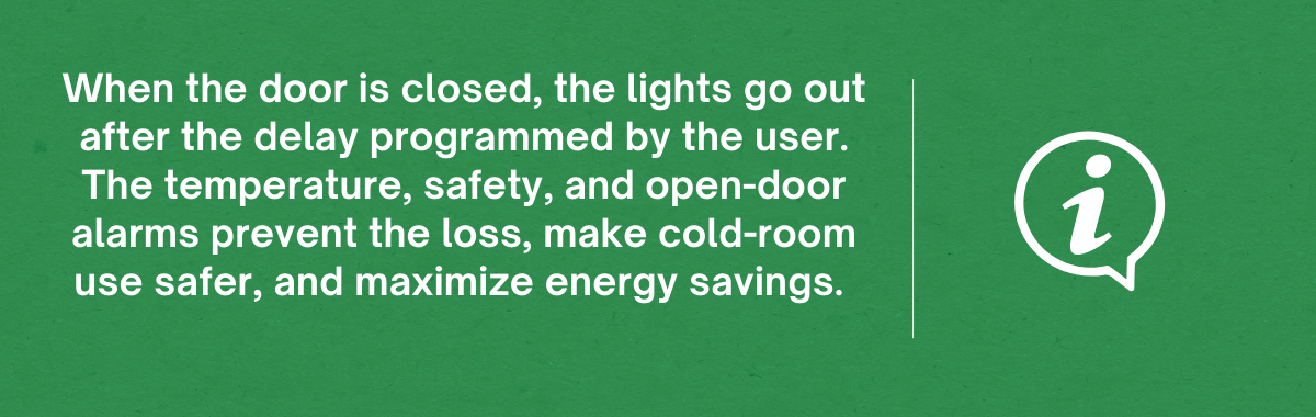 The automatic lighting control and adjustable door defrost control can yield significant energy savings. Besides avoiding energy wastage due to unnecessary lighting, a lighted bulb generates heat that is an additional load on the cold-room’s refrigeration system.